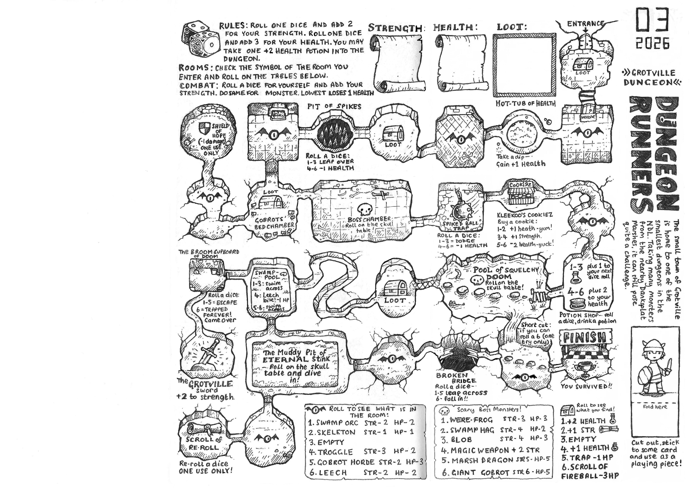 Can you survive to the end of the dungeon? This is a printable board game where you have to roll on the tables, battle monsters and use magic items to reach the finish. All you need is a dice and a pencil!